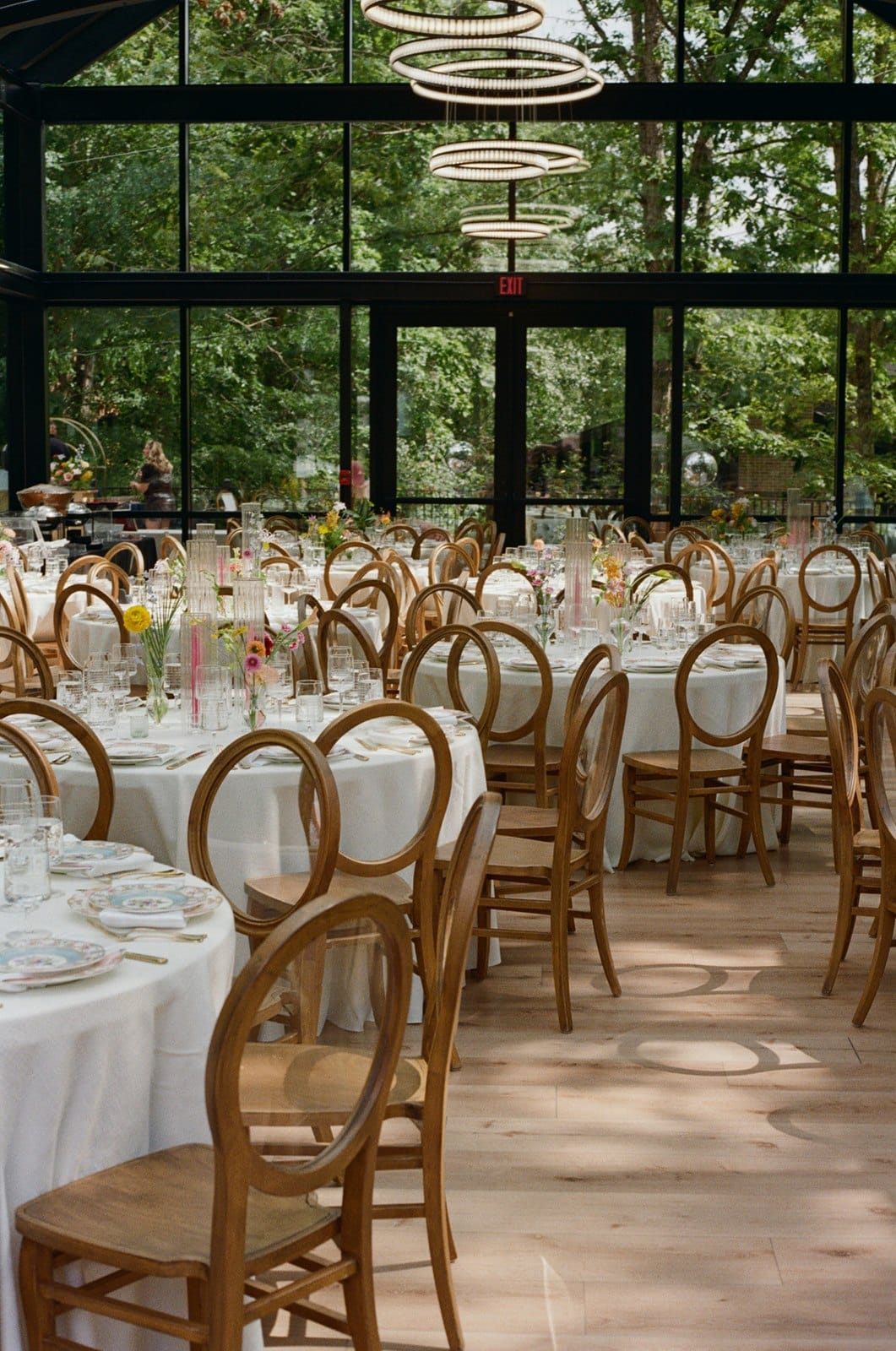 Planner Tip: The glasshouse is a natural showstopper, so lean into décor that enhances rather than competes with the space. Colorful glassware, lot’s of greenery, and statement florals do the trick without overpowering the clean architecture.